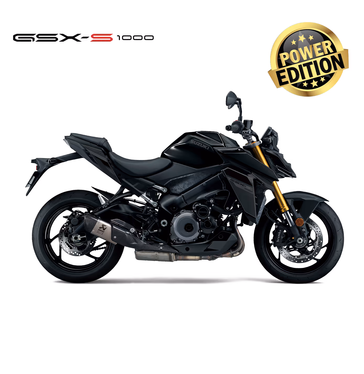 Die Suzuki GSX-S1000 Power Edition hebt das Fahrerlebnis auf ein neues Level, indem sie die beeindruckende Leistung der GSX-S1000 mit einem serienmäßigen Akrapovič Slip-On Endschalldämpfer kombiniert. Dieser hochwertige Titan-Schalldämpfer reduziert das Gewicht und verleiht dem Motorrad einen kraftvollen, unverwechselbaren Klang. Angetrieben von einem 999 cm³ Reihenvierzylinder-Motor mit 112 kW (152 PS) und einem Drehmoment von 106 Nm, bietet sie beeindruckende Beschleunigung und Durchzugskraft. Das aggressive Streetfighter-Design mit scharfen Linien und markanter Front unterstreicht ihren dynamischen Charakter. Moderne Technologien wie das Suzuki Intelligent Ride System (S.I.R.S.) mit verschiedenen Fahrmodi, Traktionskontrolle und bidirektionalem Quick-Shifter sorgen für ein sicheres und anpassungsfähiges Fahrerlebnis. Das 5-Zoll-TFT-Farbdisplay liefert alle wichtigen Informationen auf einen Blick und bleibt selbst bei direkter Sonneneinstrahlung perfekt ablesbar. Mit einem Leergewicht von 214 kg und einem 19-Liter-Tank ist die GSX-S1000 Power Edition sowohl für sportliche Fahrten als auch für längere Touren bestens geeignet.